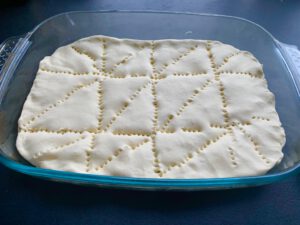 Ein paar „Luftlöcher“ mit der Gabel in den Blätterteig stechen.