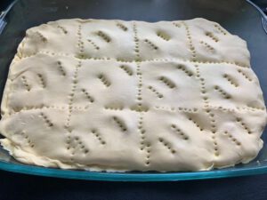 Ein paar „Luftlöcher“ mit der Gabel in den Blätterteig stechen.