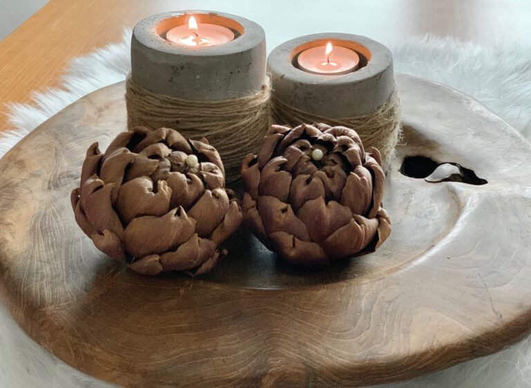 Einfach Artischocken im Lebensmittelladen kaufen, eine oder auch mehrere Perlenstecknadeln hineinstecken und trocknen lassen. Am Anfang sind die Artischocken grün, nach und nach bekommen sie eine schöne Grau-braune Farbe.
