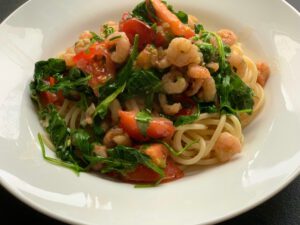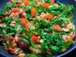 Zwiebel und gepressten Knoblauch im Olivenöl in einer großen Pfanne kurz auf hohe dann bei mittlerer Hitze anbraten, bis die Zwiebeln weich werden. Immer wieder rühren.