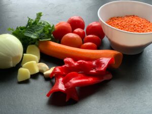 Zwiebel, Möhre, Paprika, Tomaten, Ingwer, Knoblauch waschen und kleinschneiden.